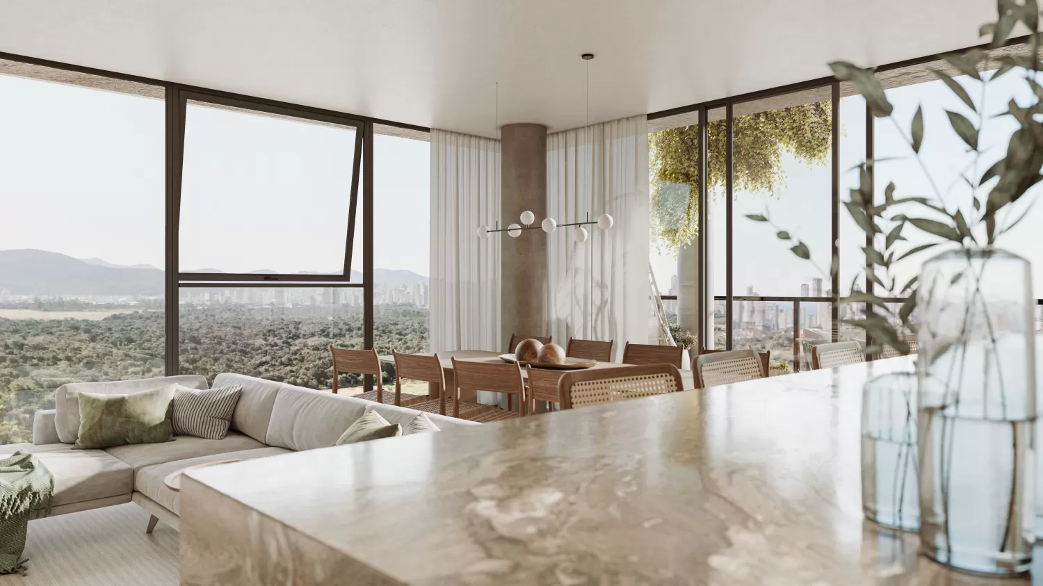 Com movimentos arquitetônicos marcantes, o edifício se desenha com volumetrias em cubos, pilares arredondados e esquinas ativas, criando diferentes perspectivas e interações com a cidade. A exposição solar em todas as faces, aliada à ventilação cruzada e ao distanciamento entre as unidades, garante conforto térmico, iluminação natural e privacidade.
