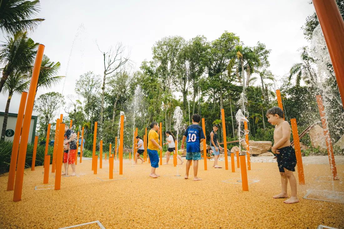 Ao lado do Mico, o Play Acqua amplia o contato sensorial com os ciclos da água. De um lado, o espaço simula uma nascente que brota da mata, forma pequenos lagos temporários e incorpora areia, pedras e estruturas naturais. Do outro lado, voltado para o lago principal, jatos e elementos verticais criam uma experiência dinâmica, convidando a brincadeiras coletivas e interações espontâneas. A proposta contempla diferentes faixas etárias e favorece tanto o brincar livre quanto momentos de convivência familiar.